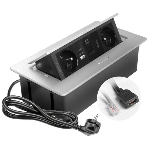 Gniazdo meblowe MULTISOFT wpuszczane w blat 2x gniazdo z uziemieniem, USB A+C RJ45 HDMI 2.0 GTV aluminium