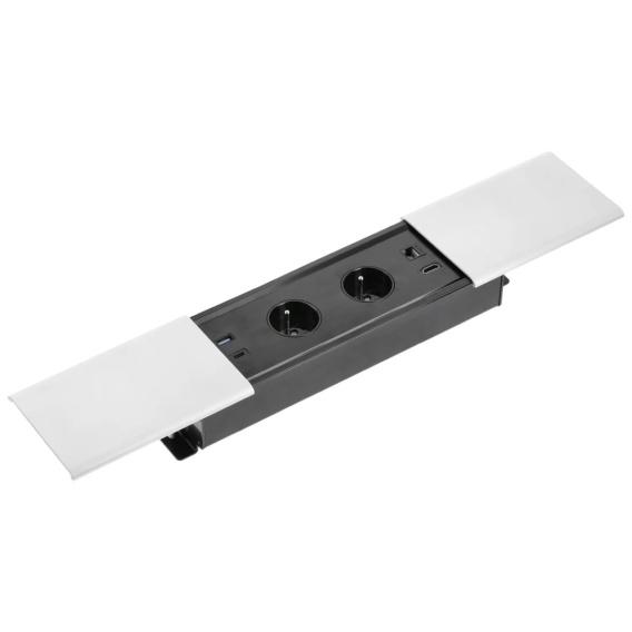 Prestino to nowoczesne gniazdo meblowe zaprojektowane z myślą o estetyce i funkcjonalności przestrzeni roboczej. Niski profil konstrukcji umożliwia niemal całkowite zlicowanie z powierzchnią blatu, co minimalizuje ryzyko zahaczenia i ułatwia utrzymanie porządku. Zintegrowana przesuwna przesłona z domknięciem magnetycznym skutecznie zabezpiecza gniazda przed wilgocią, kurzem i innymi zanieczyszczeniami. Rozwiązanie to zwiększa trwałość i niezawodność komponentów, nawet w intensywnie użytkowanych przestrzeniach.