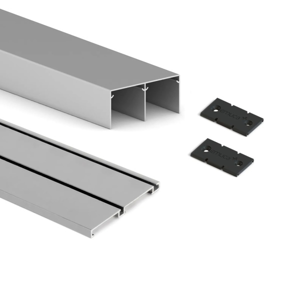Komplet torów z zatrzaskami do drzwi przesuwnych Placard 74 2.35m to komplet szyn górnych (74x34 mm) i dolnych (74x6 mm), przeznaczony do montażu szafy o maksymalnej wadze do 70 kg na drzwi. Tory dostarczane są w długości 2350 mm i mogą być przycięte do potrzebnych wymiarów. Komplet torów z zatrzaskami do drzwi przesuwnych Placard 74 2.35m jest produktem hiszpańskiego producenta Emuca.