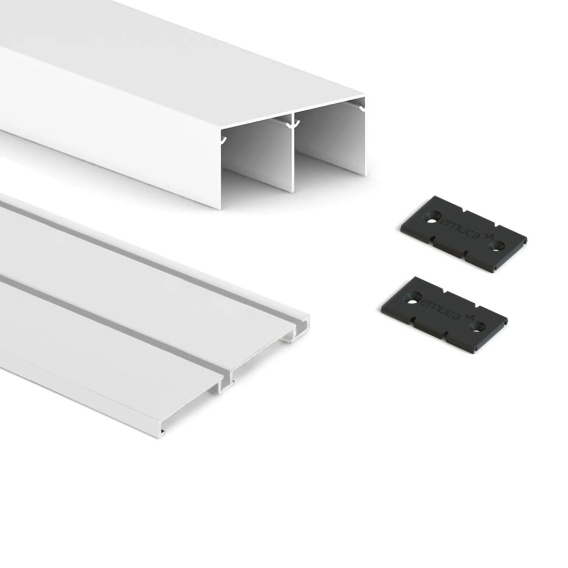 Komplet torów z zatrzaskami do drzwi przesuwnych Placard 74 2.35m to komplet szyn górnych (74x34 mm) i dolnych (74x6 mm), przeznaczony do montażu szafy o maksymalnej wadze do 70 kg na drzwi. Tory dostarczane są w długości 2350 mm i mogą być przycięte do potrzebnych wymiarów. Komplet torów z zatrzaskami do drzwi przesuwnych Placard 74 2.35m jest produktem hiszpańskiego producenta Emuca.