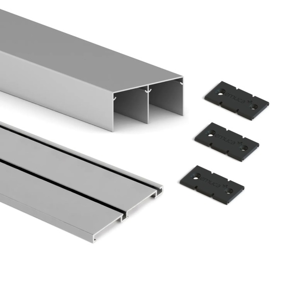 Komplet torów z zatrzaskami do drzwi przesuwnych Placard 74 3m to komplet szyn górnych (74x34 mm) i dolnych (74x6 mm), przeznaczony do montażu szafy o maksymalnej wadze do 70 kg na drzwi. Tory dostarczane są w długości 3000 mm i mogą być przycięte do potrzebnych wymiarów. Komplet torów z zatrzaskami do drzwi przesuwnych Placard 74 3m jest produktem hiszpańskiego producenta Emuca.