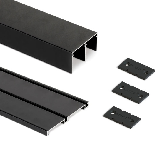 Szyny wykonane są z wysokiej jakości aluminium i malowane na czarno,  co gwarantuje trwałość i nowoczesny wygląd. Aby w pełni skompletować system, należy dokupić uchwyty i wózki.