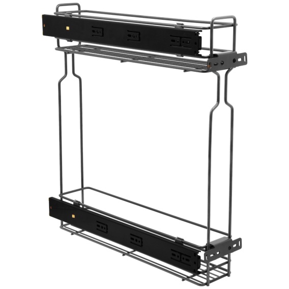 Kosz Cargo Mini 15 2 BL Poziomy bocznego montażu CICHY DOMYK Grafit przeznaczony jest do szafek kuchennych o rozmiarze 150mm. Kosz ten wyposażony jest w prowadnice pełnego wysuwu z systemem cichego domyku. System pełnego wysuwu pozwala na łatwy dostęp do zawartości szafki, a samodociąg z hamulcem gwarantuje ciche domykanie. Cargo posiada dwa mocowania do frontu meblowego wraz śrubkami i wkrętami. Łatwy montaż i demontaż kosza z części prowadnic.