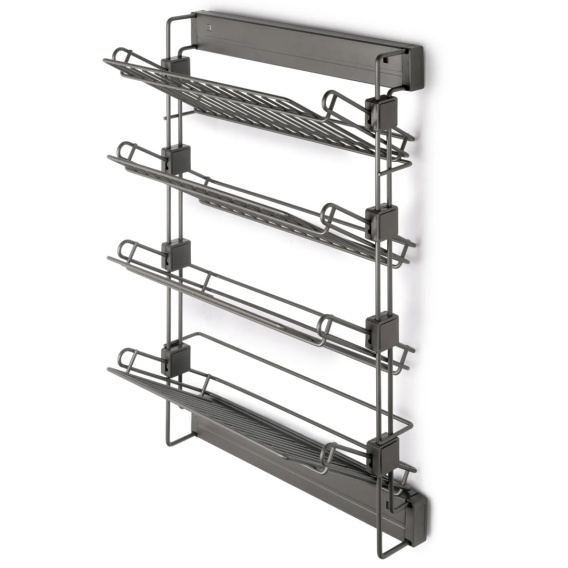 Praktyczna półka na buty montowana po prawej stronie szafy lub garderoby, idealna do organizacji obuwia i optymalizacji przestrzeni. Wyposażona w ukryte prowadnice z pełnym wysuwem i miękkim domykiem, zapewnia płynne i ciche działanie. Posiada 4 regulowane tace, które można ustawić poziomo lub pod kątem 90°, dostosowując je do różnych typów butów.