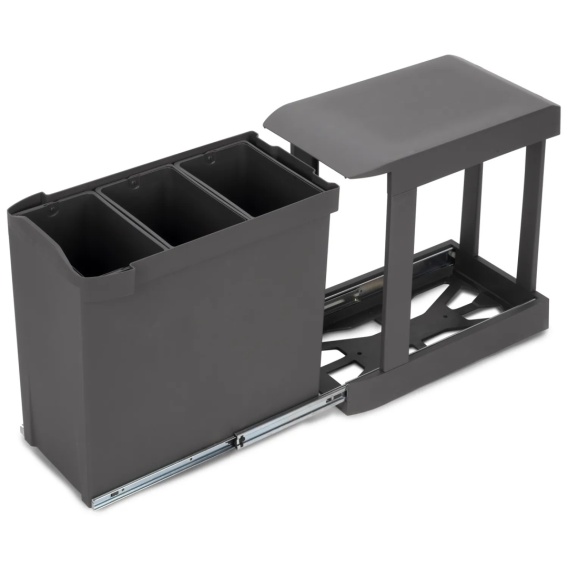 Kosz segregator na śmieci wysuwany 3x10L montaż dolny w kolorze antracytowym to bardzo duże udogodnienie w nowoczesnej kuchni. Takie przestrzenie słyną ze sprytnych rozwiązań, które pozwalają na zaoszczędzenie miejsca. Kosz przeznaczony jest do montażu w szafce. Prowadnice umożliwiają pełne wysunięcie. Kosz wyposażony jest w trzy pojemniki 10L, które posiadają uchwyty ułatwiające wyjmowanie, dzięki czemu łatwo jest opróżniać i czyścić kosz. Kosz może być wysuwany z szafki ręcznie lub automatycznie po przymocowaniu do frontu.