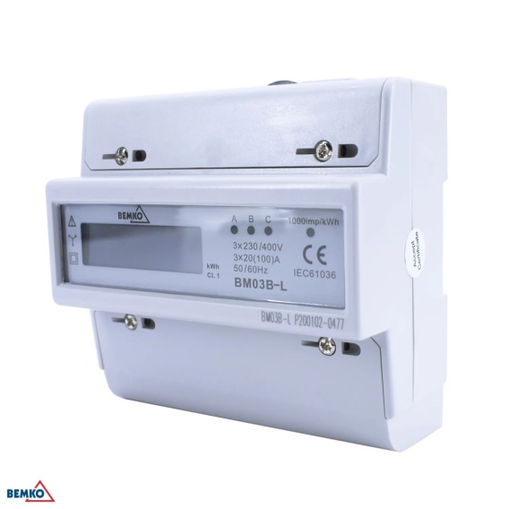 Licznik trójfazowy podlicznik energii prądu BM03B służy do wskazywania stanu zużycia energii elektrycznej prądu przemiennego trójfazowego w układzie bezpośrednim. Wartość wyświetlona na ekranie LCD jest sumą impulsów z trzech faz, która przeliczana jest na energię pobraną w układzie trójfazowym. Zużycie energii wyświetla się w kilowatogodzinach (kWh). Produkt charakteryzuje się dużą dokładnością. Posiada kontrolki stopnia obciążenia faz i wyświetlacz LCD 6+1 cyfr. Licznik został zaprojektowany, wyprodukowany i testowany zgodnie z międzynarodowymi normami.