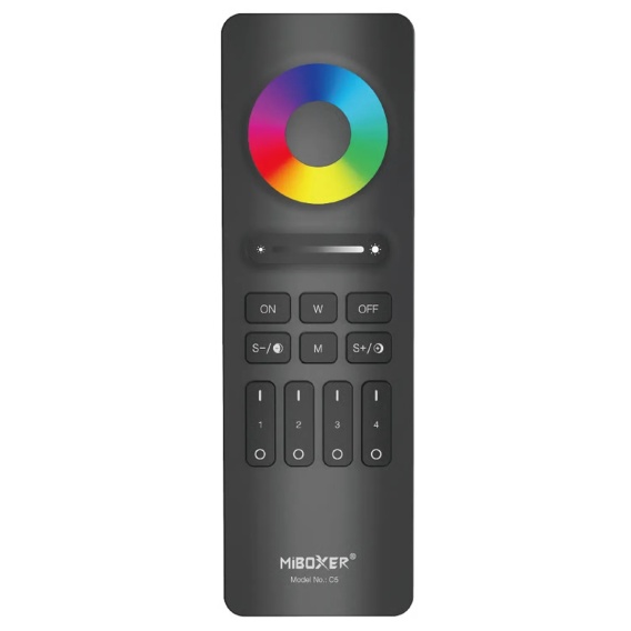 MiBoxer C5 to zaawansowany, ręczny pilot przeznaczony do sterowania oświetleniem LED RGB+CCT, który umożliwia pełną kontrolę nad kolorami, temperaturą barwową i jasnością światła w jednym, kompaktowym urządzeniu. Komunikuje się bezprzewodowo w paśmie 2.4GHz RF, gwarantując stabilne, szybkie i płynne działanie. Pilot obsługuje cztery niezależne strefy, co pozwala na elastyczne zarządzanie oświetleniem w różnych pomieszczeniach lub częściach instalacji. Dzięki dotykowemu pierścieniowi kolorów i intuicyjnym przyciskom sterowanie światłem jest szybkie i precyzyjne. Urządzenie jest kompatybilne z odbiornikami MiBoxer RGB+CCT, co umożliwia stworzenie rozbudowanego systemu inteligentnego oświetlenia.