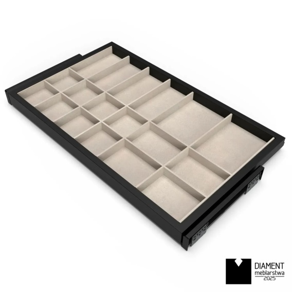 Półka szuflada organizer do szafy przeznaczona jest do garderoby oraz szaf wnękowych. Dzięki niej jest lepszy dostęp i widoczność zawartości szafy. Sprzedawana jest w komplecie z ramą wyposażoną w prowadnice z systemem cichego domyku.