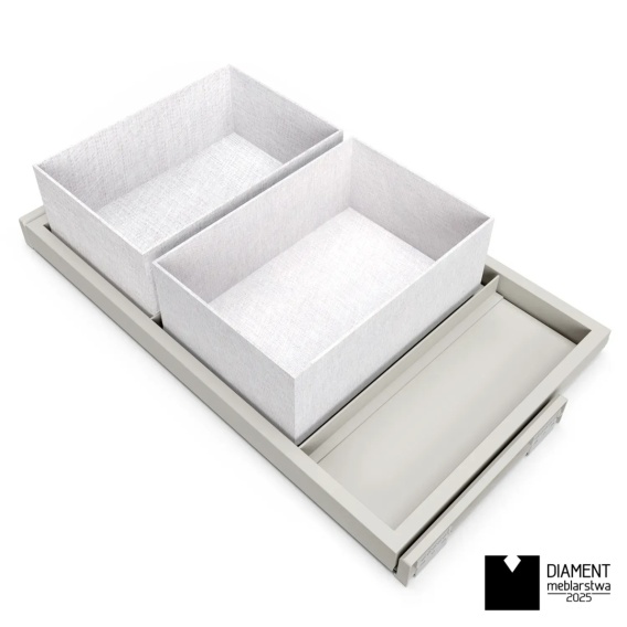 Półka taca do szafy przeznaczona jest do garderoby oraz szaf wnękowych. Dzięki niej jest lepszy dostęp i widoczność zawartości szafy. Sprzedawana jest w komplecie z ramą wyposażoną w prowadnice z systemem cichego domyku.