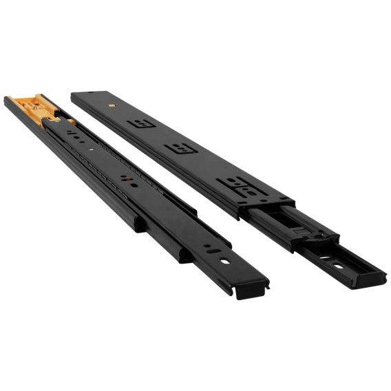 Prowadnica kulkowa H-45 CICHY DOMYK Emuca CZARNA z pełnym wysuwem doskonale sprawdzi się we wszystkich rodzajach wysuwanych półek i szuflad. System pełnego wysuwu pozwala na łatwy dostęp do zawartości szuflady, a samodociąg z hamulcem gwarantuje ciche domykanie. Prowadnica posiada możliwość demontażu części prowadnika oraz mechanizm zabezpieczający przed wypadnięciem szuflady.