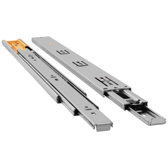 Prowadnica kulkowa H-45 CICHY DOMYK Emuca OCYNK z pełnym wysuwem doskonale sprawdzi się we wszystkich rodzajach wysuwanych półek i szuflad. System pełnego wysuwu pozwala na łatwy dostęp do zawartości szuflady, a samodociąg z hamulcem gwarantuje ciche domykanie. Prowadnica posiada możliwość demontażu części prowadnika oraz mechanizm zabezpieczający przed wypadnięciem szuflady.
