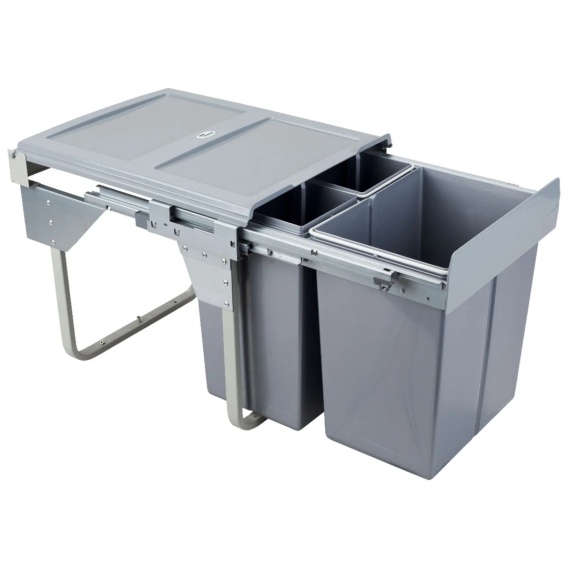 Segregator na śmieci potrójny 450 Cichy Domyk CLG-606-3 AMIX idealnie pasuje do szafek kuchennych. Produkt wyposażony jest w prowadnice pełnego wysuwu z systemem cichego domyku. System pełnego wysuwu pozwala ułatwia dostęp do pojemników, a samodociąg z hamulcem gwarantuje ciche domykanie. W skład produktu wchodzi stelaż oraz trzy pojemniki: 2x10 L i 1×20 L.