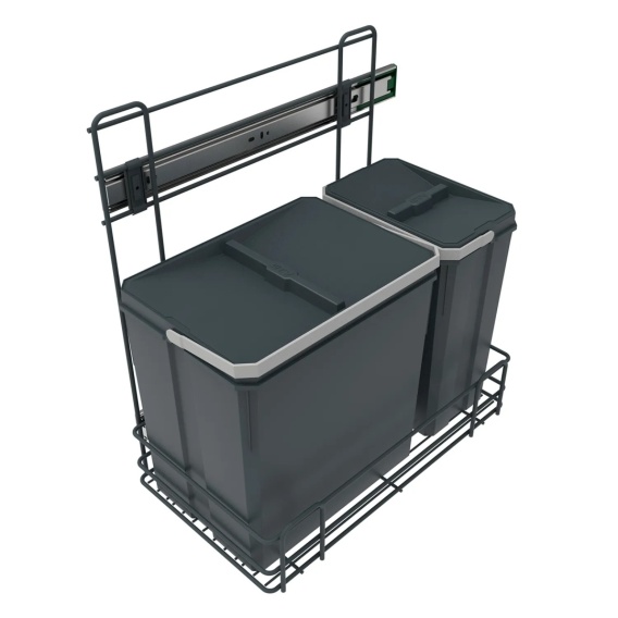 Kosz Segregator na śmieci podwójny idealnie pasuje do szafek kuchennych. Produkt wyposażony jest w prowadnice pełnego wysuwu z systemem cichego domyku. System pełnego wysuwu pozwala na łatwy dostęp do zawartości szuflady, a samodociąg z hamulcem gwarantuje ciche domykanie.