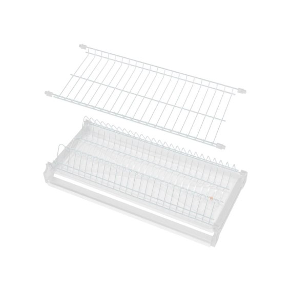 Suszarka do naczyń ze stelażem dwupoziomowa do szafki przeznaczona zabudowy w szafkach kuchennych wiszących. Dolną półkę ociekarki stanowią dwa profile wraz z zaczepami mocującymi, dzięki temu nie ma potrzeby montażu wieńca dolnego z płyty.
