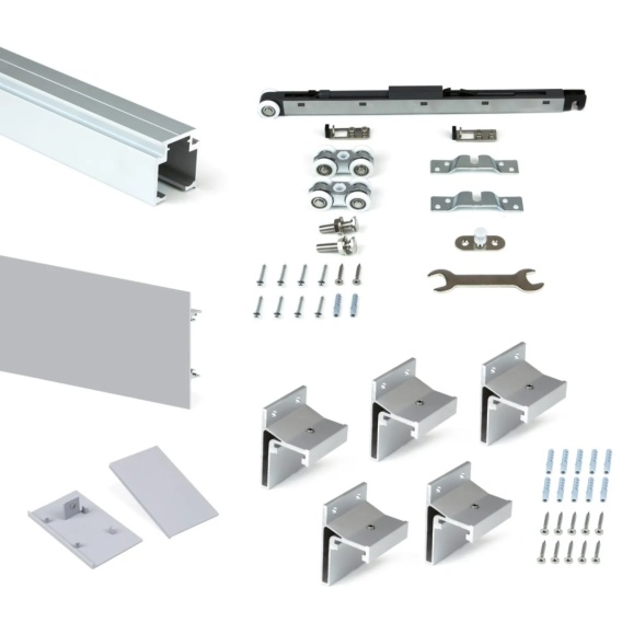 System Railway do drzwi przesuwnych ZESTAW to kompletny zestaw do podwieszanych drzwi drewnianych (z wyjątkiem płyty meblowej) do montażu pod sufitem lub na ścianie o grubości od 18 do 40mm. Maksymalne obciążenie systemu wynosi 80 kg. System posiada funkcję cichego domyku, który jest dwukierunkowy i działa zarówno przy otwieraniu, jak i przy zamykaniu. Wózki posiadają kółka wyposażone w łożyska kulkowe z regulowaną wysokością do 10mm i systemem blokującym wypadanie. Całość została wykonana z materiałów wysokiej jakości - prowadnice są aluminiowe, a osłony boczne są z tworzywa sztucznego.
