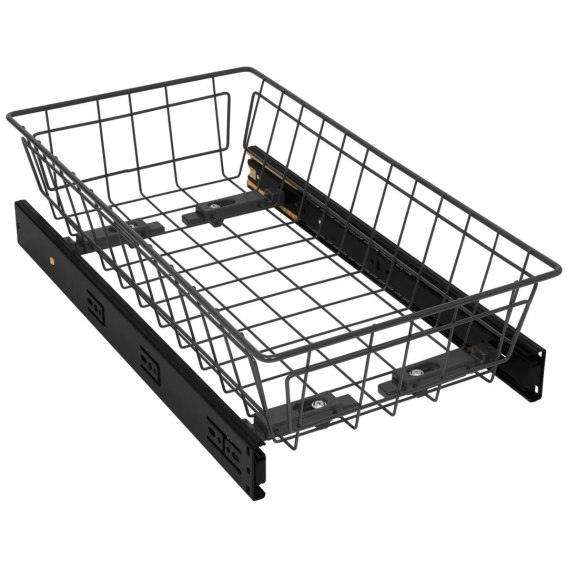 Szuflada kosz MD 40 H-100 Grafit CICHY DOMYK BL przeznaczona jest do szaf i garderoby do szuflad o rozmiarze nie większym niż 400mm. Wykonana jest z wytrzymałego drutu wykończonego w grafitowym kolorze. Szuflada MD sprzedawana jest w zestawie z czarnymi prowadnicami kulkowymi H-45 z pełnym wysuwem i cichym domykiem. System pełnego wysuwu zapewnia łatwy i nieograniczony dostęp do zawartości szuflady. Samodociąg gwarantuje ciche domykanie. Dodatkową zaletą jest łatwy montaż i demontaż szuflady z części prowadnic.