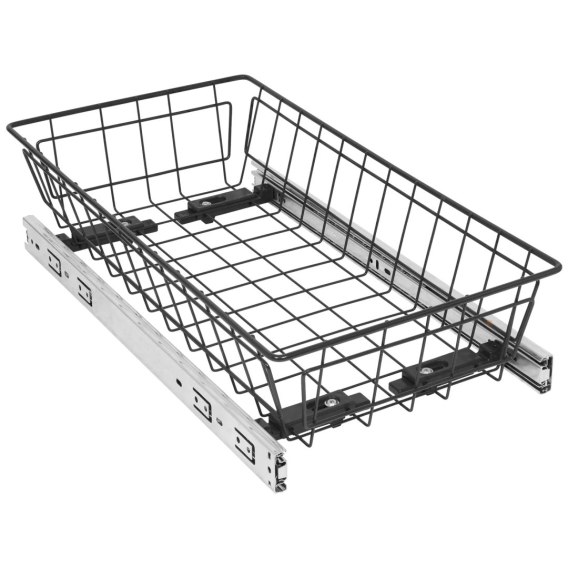 Szuflada kosz MD 40 H-100 PEŁNY WYSUW Grafit przeznaczona jest do szaf i garderoby do szuflad o rozmiarze nie większym niż 400mm. Wykonana jest z wytrzymałego drutu wykończonego w grafitowym kolorze. Szuflada MD sprzedawana jest w zestawie z prowadnicami kulkowymi H-35 z pełnym wysuwem. System pełnego wysuwu zapewnia łatwy i nieograniczony dostęp do zawartości szuflady. Dodatkową zaletą jest łatwy montaż i demontaż szuflady z części prowadnic.