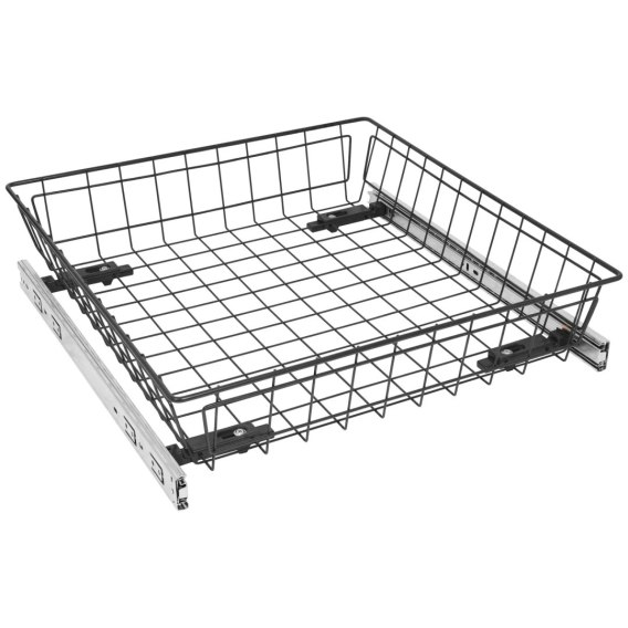 Szuflada kosz MD 50 H-100 PEŁNY WYSUW Grafit przeznaczona jest do szaf i garderoby do szuflad o rozmiarze nie większym niż 500mm. Wykonana jest z wytrzymałego drutu wykończonego w grafitowym kolorze. Szuflada MD sprzedawana jest w zestawie z prowadnicami kulkowymi H-35 z pełnym wysuwem. System pełnego wysuwu zapewnia łatwy i nieograniczony dostęp do zawartości szuflady. Dodatkową zaletą jest łatwy montaż i demontaż szuflady z części prowadnic.