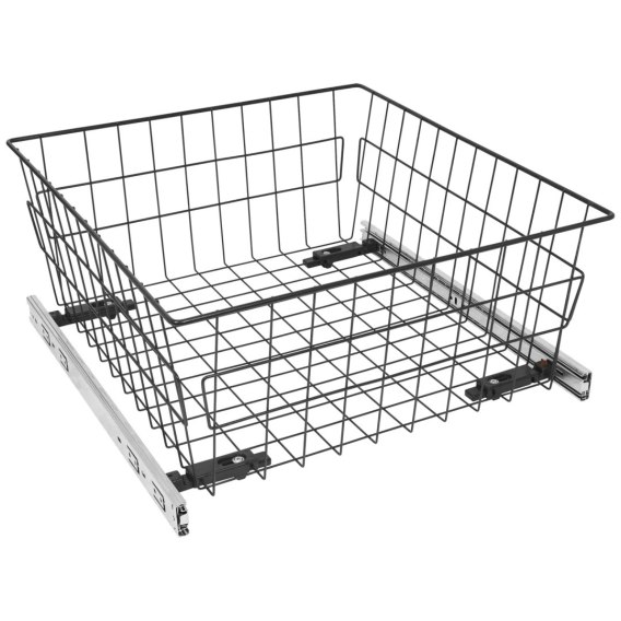Szuflada kosz MD 50 H-200 PEŁNY WYSUW Grafit przeznaczona jest do szaf i garderoby do szuflad o rozmiarze nie większym niż 500mm. Wykonana jest z wytrzymałego drutu wykończonego w grafitowym kolorze. Szuflada MD sprzedawana jest w zestawie z prowadnicami kulkowymi H-35 z pełnym wysuwem. System pełnego wysuwu zapewnia łatwy i nieograniczony dostęp do zawartości szuflady. Dodatkową zaletą jest łatwy montaż i demontaż szuflady z części prowadnic.