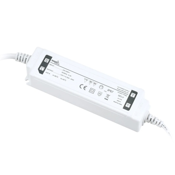 Wysokiej jakości zasilacz LED marki Bemko o mocy 40W, przeznaczony do zasilania instalacji oświetlenia LED wymagających napięcia stałego 12V DC. Dzięki hermetycznej obudowie o stopniu szczelności IP67, doskonale sprawdza się zarówno wewnątrz, jak i na zewnątrz pomieszczeń - odporny na pył, wilgoć i zanurzenie w wodzie.