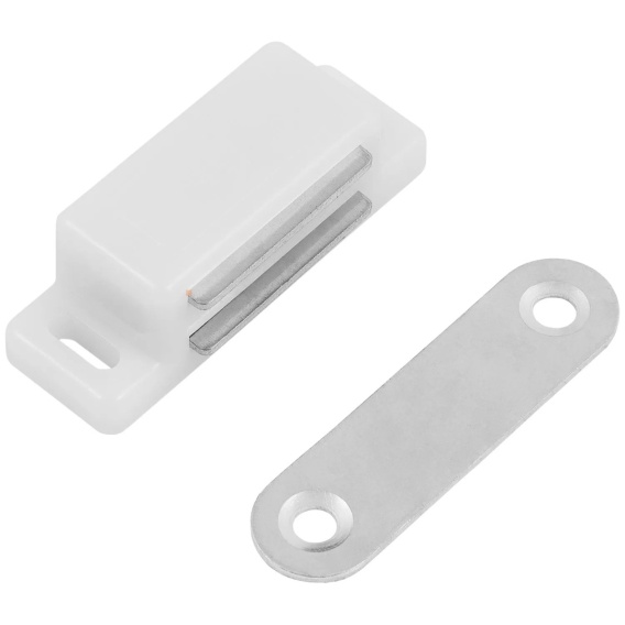 Zatrzask Zamek magnetyczny do szafek meblowych wykonany z metalu oraz tworzywa sztucznego. Komplet składa się z dwóch elementów - zatrzask z magnesem oraz metalowa płytka. Produkt przeznaczony do montażu w szafkach meblowych. Zatrzask ma za zadanie przytwierdzić front szafki do jej korpusu - w pozycji zamkniętej.