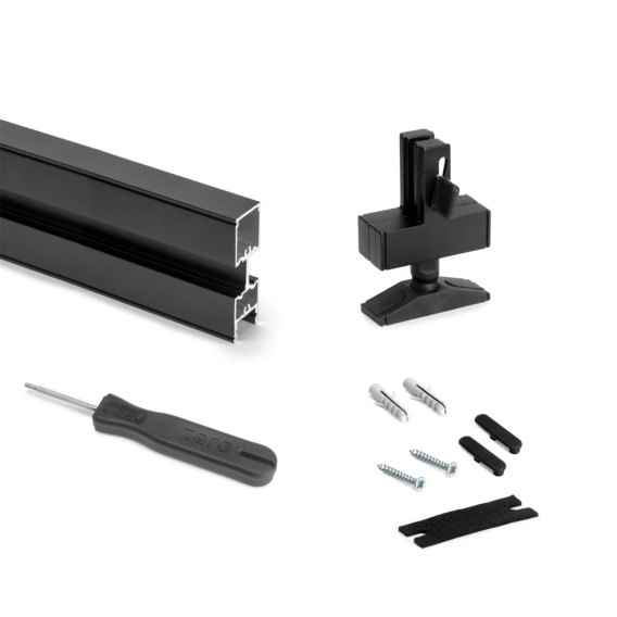 Zestaw 2 profili montaż podłoga/sufit ZERO Czarny, zawierający profile Zero, o długości 2900 mm oraz wszystkie niezbędne akcesoria do montażu na suficie i podłodze. W skład tej kompozycji wchodzą prostokątne niwelatory. Dzięki swojej prostocie i designowi, będziesz mógł szybko dostosować system Zero do każdego rodzaju środowiska: domu, garderoby, biura i sklepów.